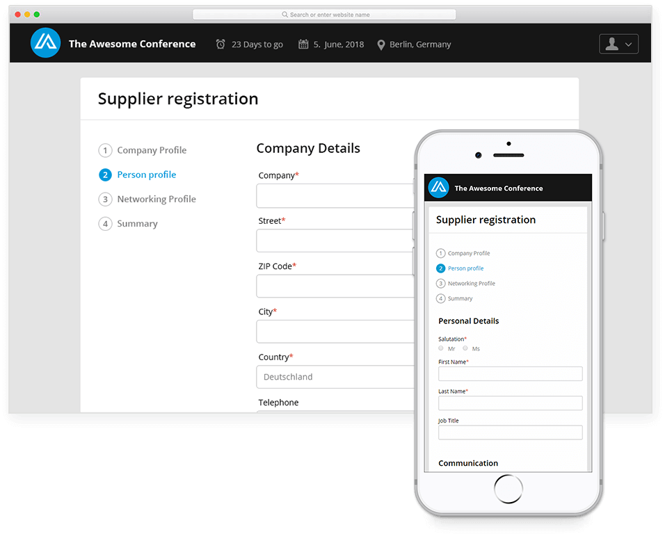 When registering as a participant, make sure you choose the correct participant category and agree to our privacy policy. Enter your company profile and personal data. In the networking profile, you describe your goals at the event and enter other networking relevant information in order to find the perfect networking match amongst participants.